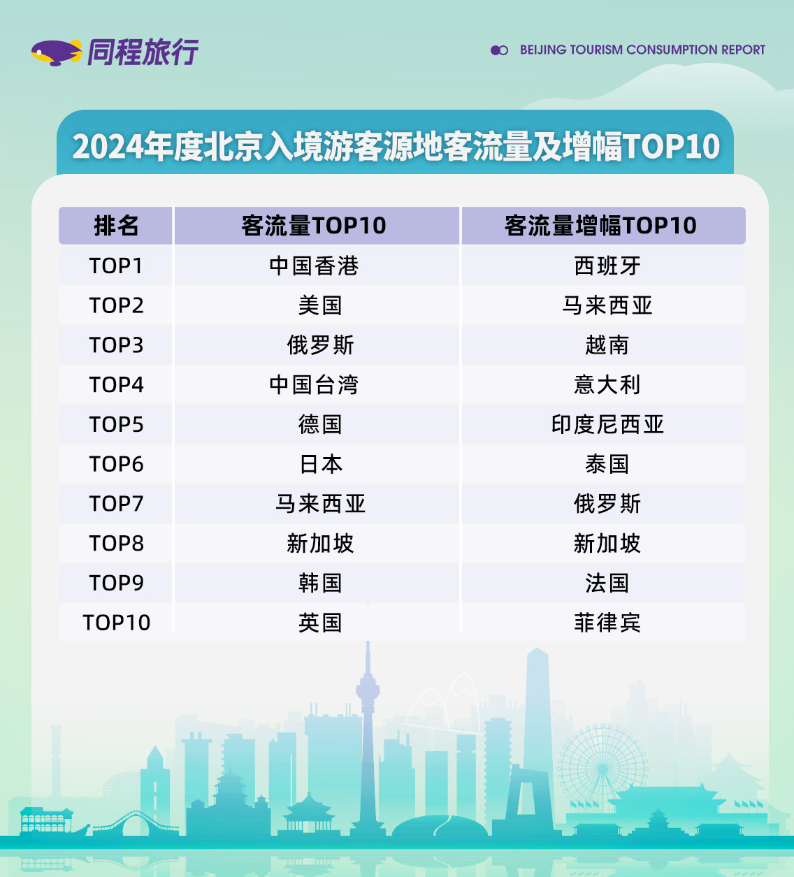 入境游的爆发式反弹是2024年度北京旅游破钞的一大亮点。北京市文化和旅游局发布的数据败露,2024年1月至10月,北京共迎接入境旅客317万东谈主次,同比增长198.8%。《讲授》来自同程旅行平台的国外机票预订数据败露,北京位居2024年度中国入境游热点标的地首位。北京入境游的前十大客源地顺次为:中国香港、好意思国、俄罗斯、中国台湾、德国、日本、马来西亚、新加坡、韩国、英国。2024年度,伴跟着片面免签及过境免签计谋的合手续优化,北京入境游阛阓按下了“加速键”,其中,客流量增幅前十位的客源地顺次为:西班牙、马来西亚、越南、意大利、印度尼西亚、泰国、俄罗斯、新加坡、法国、菲律宾。在增幅较快的客源地中,西班牙、马来西亚、意大利、印度尼西亚、泰国等均显耀受益于签证计谋的优化。